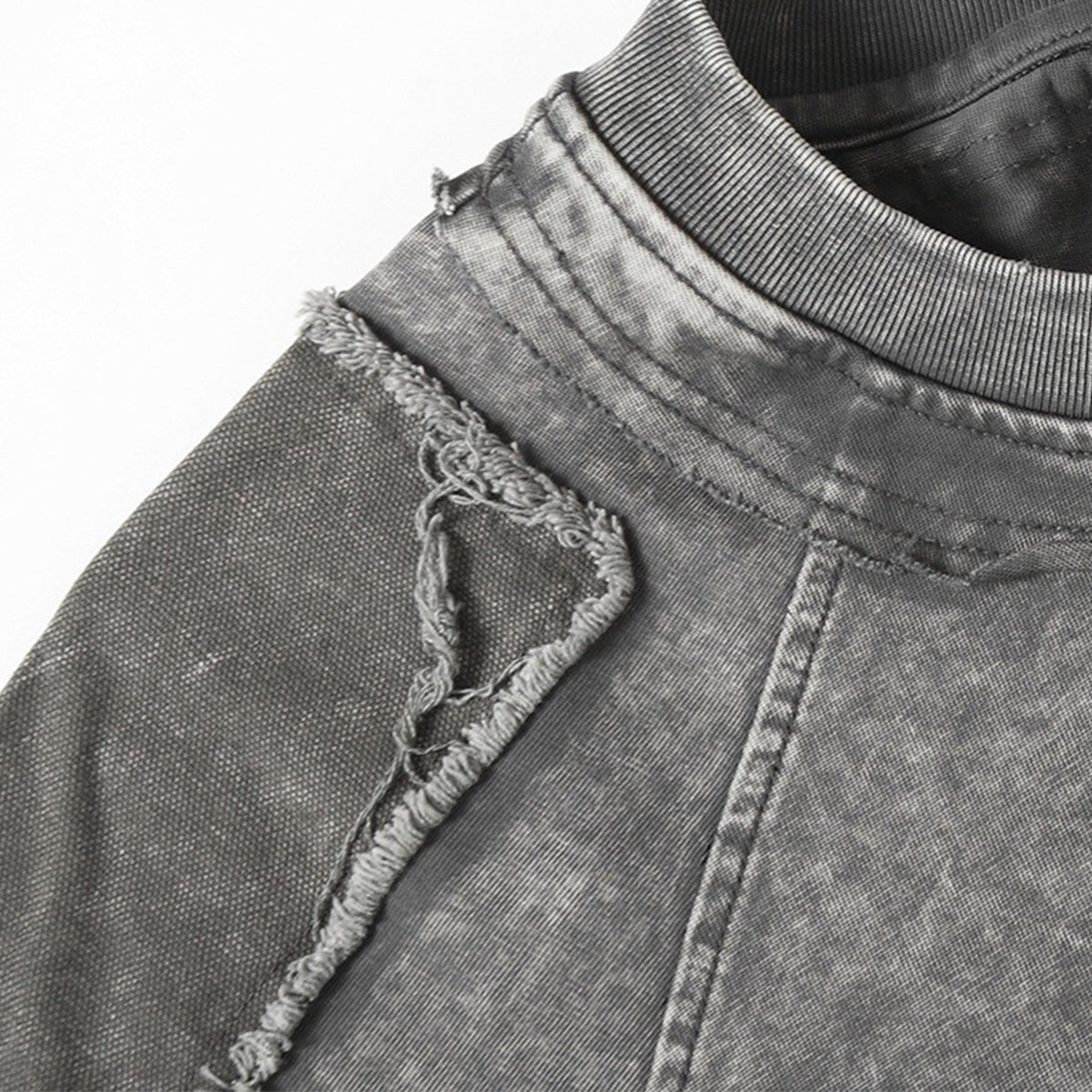 - Contrasting patchwork panels with frayed seam detailing for a distressed, edgy look