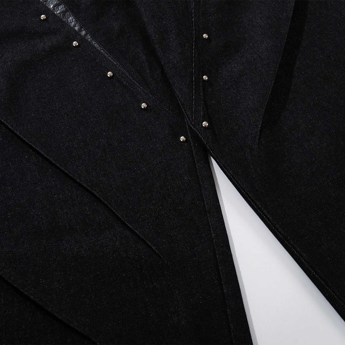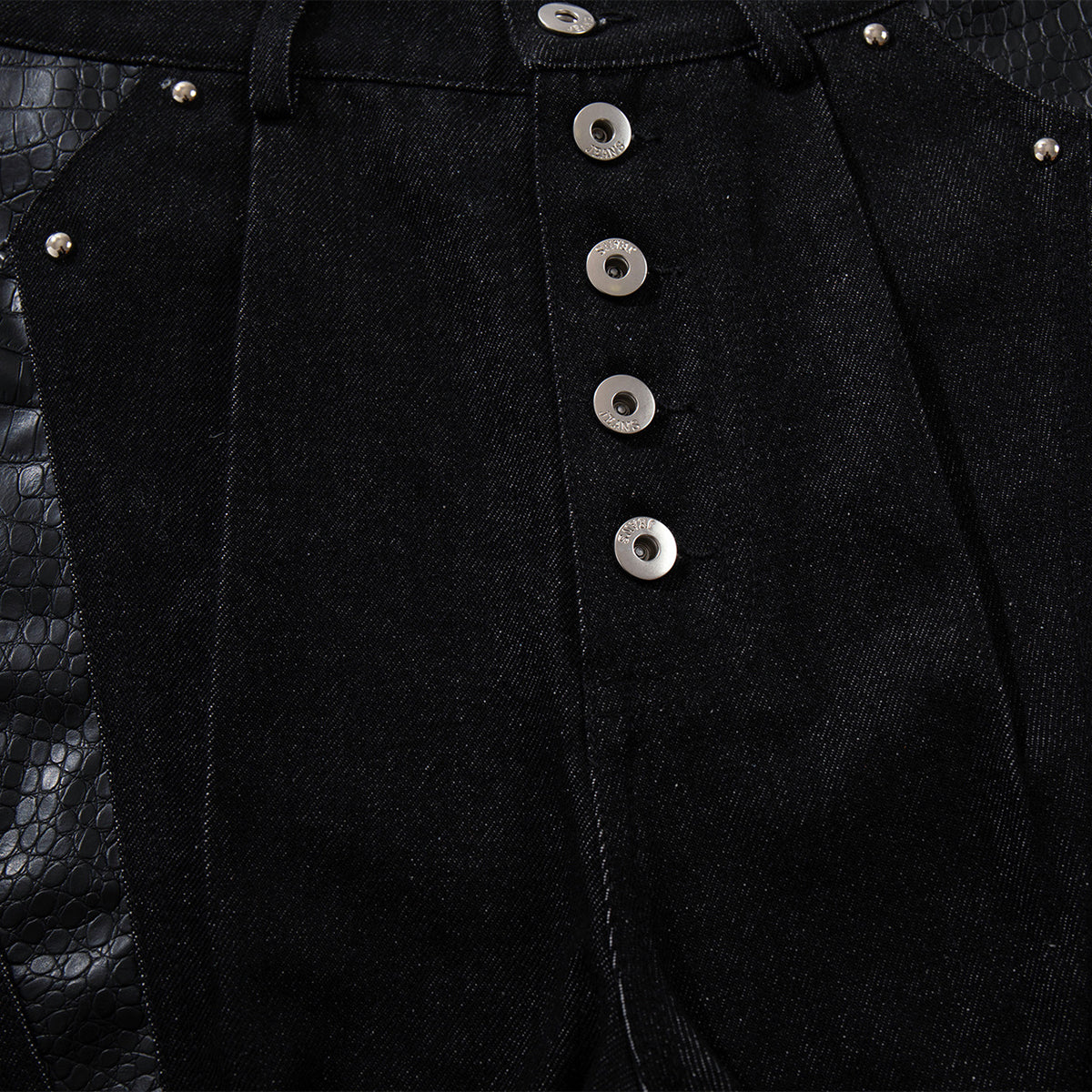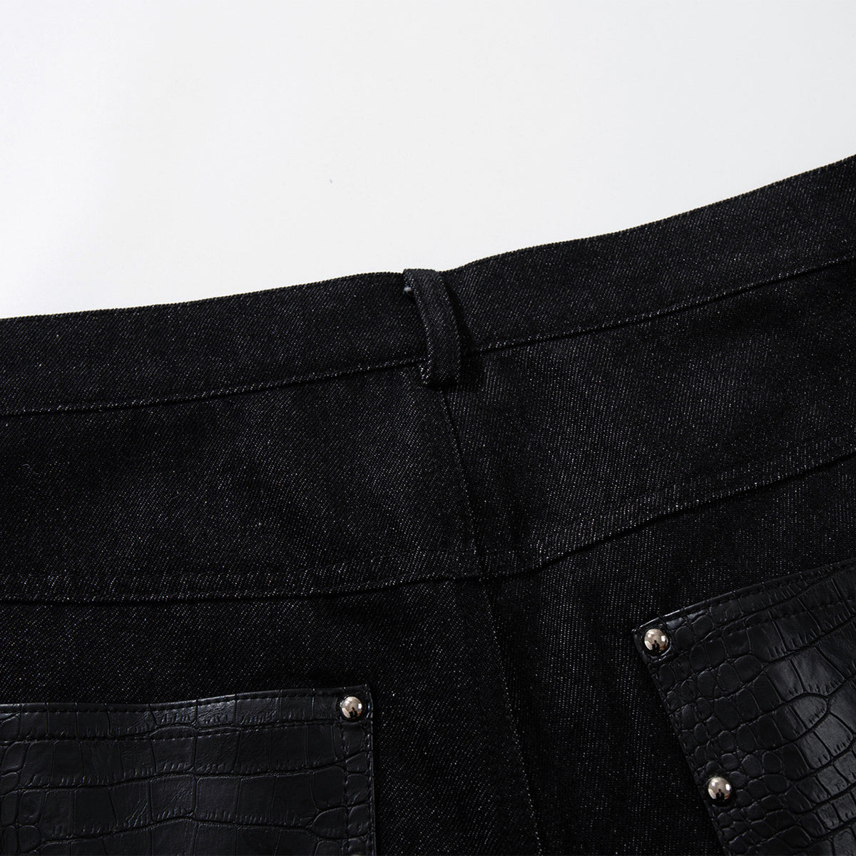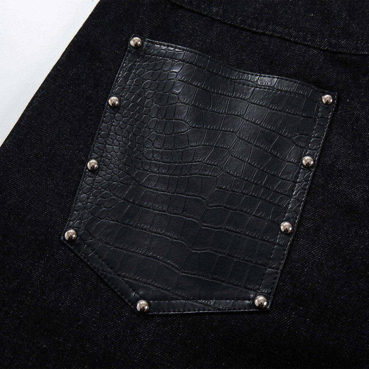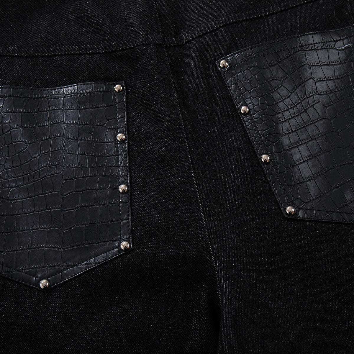 - High-quality black denim, paired with contrasting croc-textured panels for a unique, modern look