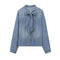 - Neckline features a striking bow tie. Bow is made of denim.