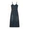 - Women's dark wash denim button-front maxi dress with spaghetti straps and pockets