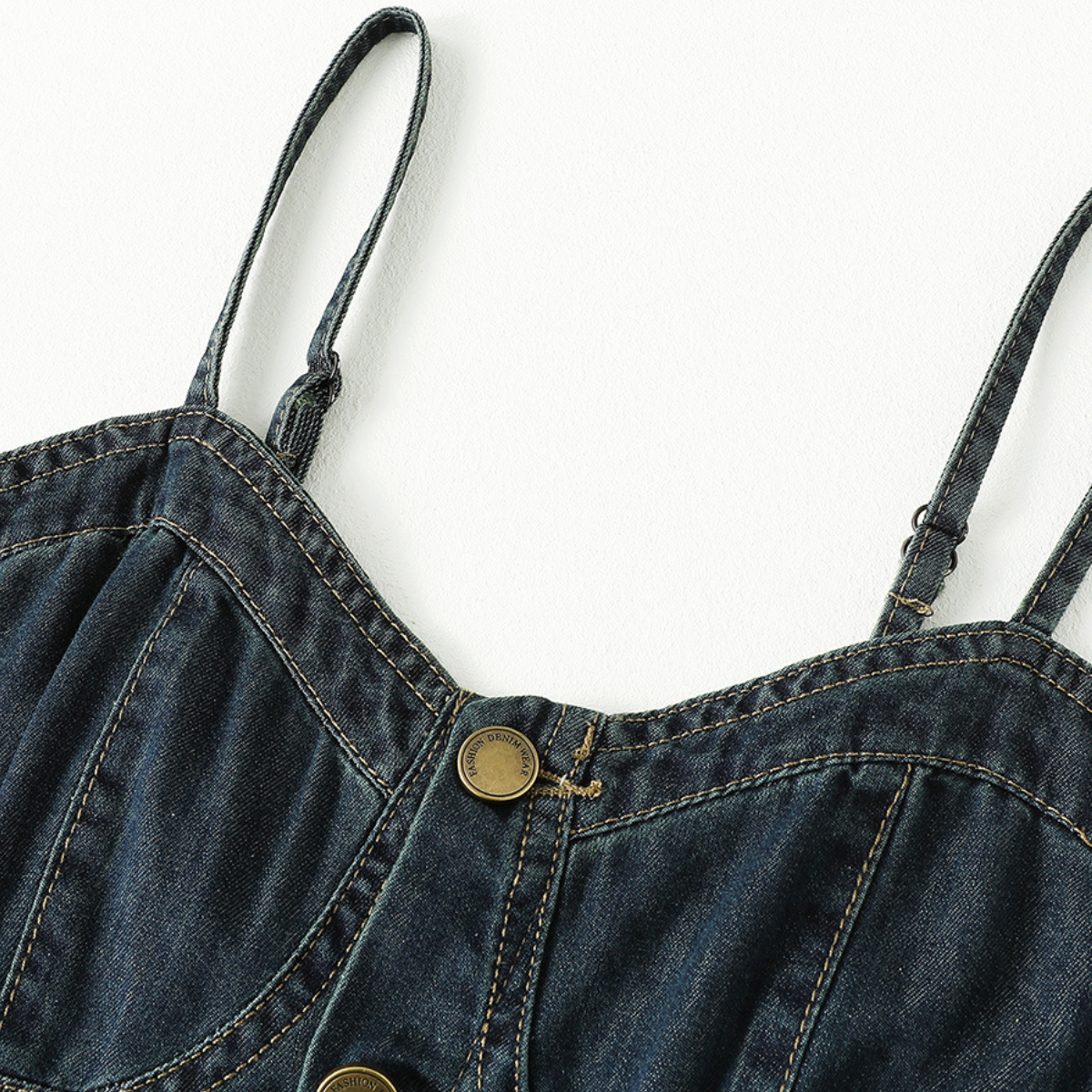 - Button-front closure with metallic hardware